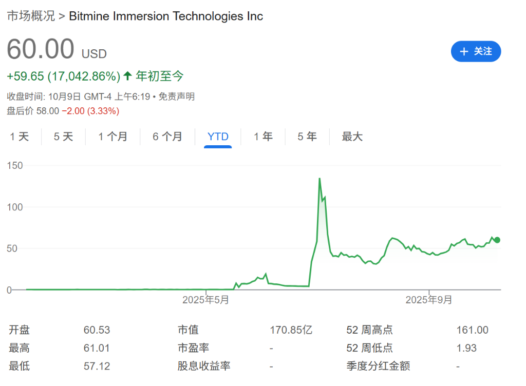 今年7月,公司股价曾最高涨至130美元/股,但现在已近腰斩。今年迄今,BitMine股价暴涨17042%。