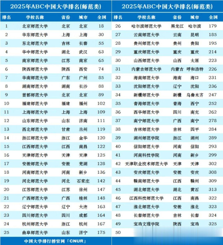 “三百六十行,行行出状元”,但在高考填报志愿的选择上,教师行业就像一颗耀眼的明珠,吸引着众多家长和考生。一直以来,大家都觉得老师不仅有令人羡慕的寒暑假,工作还既体面又稳定。再瞧瞧这几年不太乐观的就业大环境,老师这个职业和师范类高校更是变得炙手可热。要是您家孩子将来想当老师,那了解一下我国师范类高校的情况,可就太有必要啦!今天就给大家唠唠 2025 年全国师范类高校排名,家里有明年或之后参加高考孩子的,可得仔细看咯!